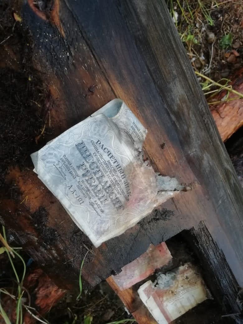 – Совершенно случайно обнаружили строительный приклад, когда бревно верхнее закидывали, в которое врубается матица (потолочная балка). Я об этом много читал, но впервые увидел. Все лето он пролежал на воздухе, частично банкноты погнили, а некоторые хорошо сохранились. Было так уложено, что за 100 лет деньги припечатались к дереву.