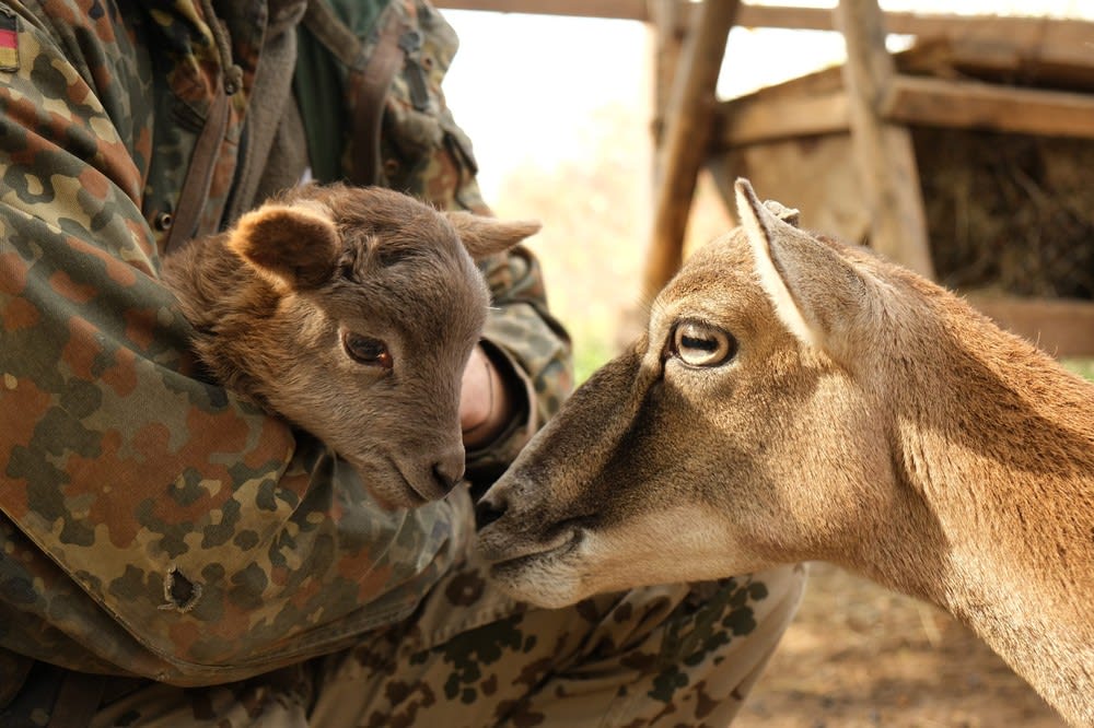 Интересно, что отцом детеныша может быть горный козел, с которым самочка уже несколько лет живет в вольере, но потомства эти животные никогда не приносили, а также обычный домашний баран, временно подсаженный в вольер к паре этой весной. Скорее всего, отцом малыша стал он. Но пока точно утверждать это нельзя.