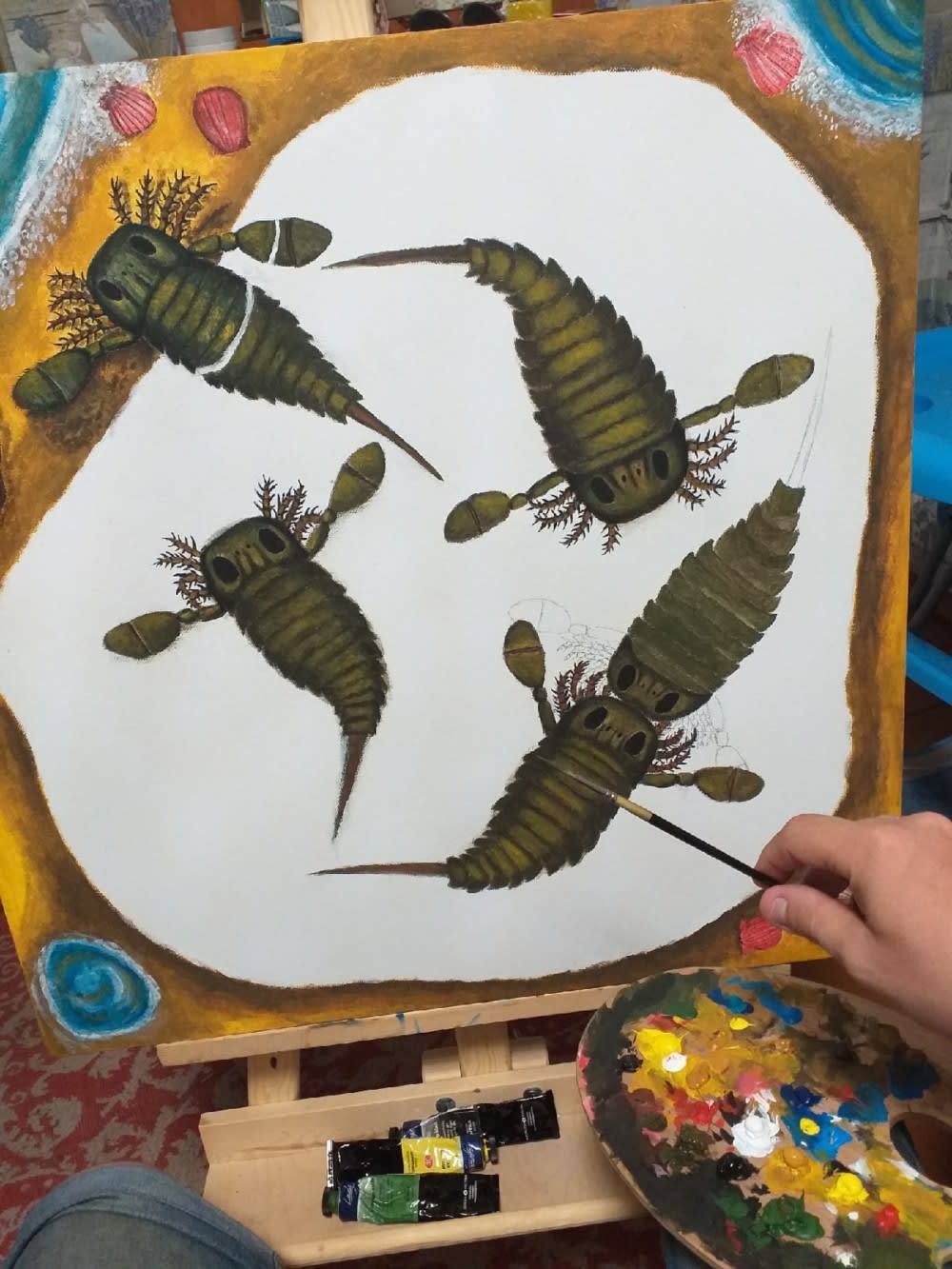 – Я рисовал с детства, потом был долгий перерыв. Сейчас пишу на холсте профессиональными красками. Занимаюсь палеоартом: изображаю древних насекомых, динозавров, трилобитов – мне всегда было это интересно. Задача – основываясь на окаменелостях и данных научной литературы, изобразить, как выглядел тот или иной вид. Помню, трилобита нарисовал, а мне коллеги говорят: «Почему у него щеки, как у одного вида трилобита, а хвост, как у другого?» Хотя мне казалось, что все верно, ведь воссоздавал изображение по фотографии окаменелости, но, видимо, мне нужно быть еще более внимательным к деталям строения животного.