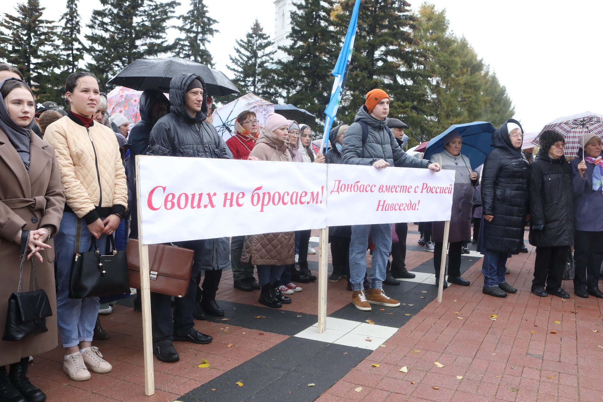 Несмотря на непогоду, площадь возле мемориала «Вечный огонь Славы» заполнена народом. Люди пришли семьями, целыми организациями, разных возрастов и национальностей, чтобы высказать слова поддержки из Сибири далекому, но родному народу.
