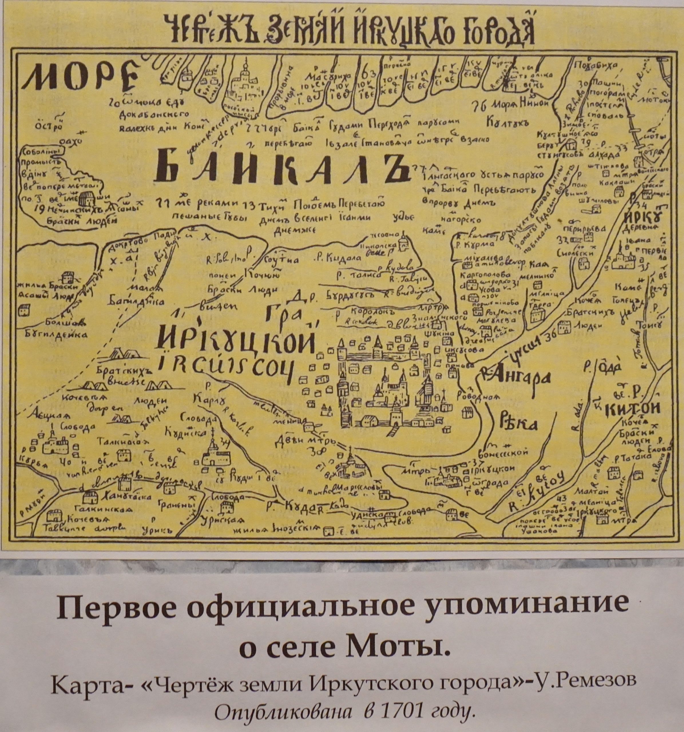 – Первое упоминание о Мотах значится на известной карте «Чертеж земли Иркутского города» Семена Ремезова, опубликованной в 1701 году. Если внимательно ее рассмотреть, можно увидеть знакомые названия населенных пунктов, расположенных по берегу Иркута: селение Смоленское, Каклаши (Баклаши), Моты, заимка Вознесенского монастыря – будущее село Введенщина. В архивах упоминается и об отписке, которую государевы служилые люди, находясь в Мотах, направили воеводе Ржевскому: «А жить нам, государь-батюшка, на тайге, на Мотах немочно, а места холодные, подморочные, а лесной зверь в розорь разорил и ест нашу скотину». Если учесть, что воевода Ржевский правил Енисейском с 1658 по 1663 годы, то значит, что в это время в селе уже находился сторожевой пост или караульная застава, – растолковывает Ирина Васильевна. – Поскольку выше по Иркуту селений больше нет, то можно предположить, что на Моты возлагали оборонную функцию при набегах со стороны Тункинской долины.