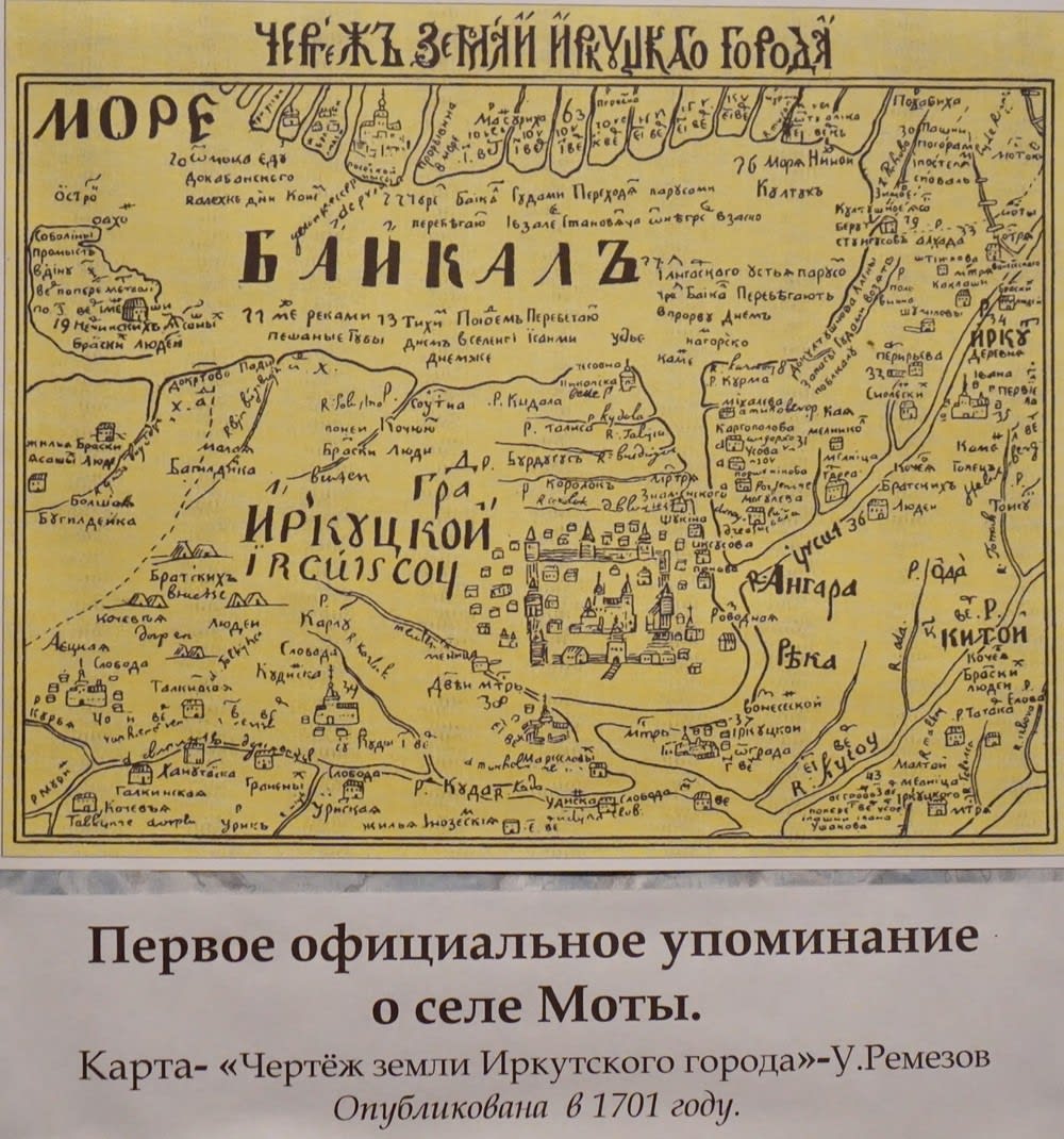 – Первое упоминание о Мотах значится на известной карте «Чертеж земли Иркутского города» Семена Ремезова, опубликованной в 1701 году. Если внимательно ее рассмотреть, можно увидеть знакомые названия населенных пунктов, расположенных по берегу Иркута: селение Смоленское, Каклаши (Баклаши), Моты, заимка Вознесенского монастыря – будущее село Введенщина. В архивах упоминается и об отписке, которую государевы служилые люди, находясь в Мотах, направили воеводе Ржевскому: «А жить нам, государь-батюшка, на тайге, на Мотах немочно, а места холодные, подморочные, а лесной зверь в розорь разорил и ест нашу скотину». Если учесть, что воевода Ржевский правил Енисейском с 1658 по 1663 годы, то значит, что в это время в селе уже находился сторожевой пост или караульная застава, – растолковывает Ирина Васильевна. – Поскольку выше по Иркуту селений больше нет, то можно предположить, что на Моты возлагали оборонную функцию при набегах со стороны Тункинской долины.