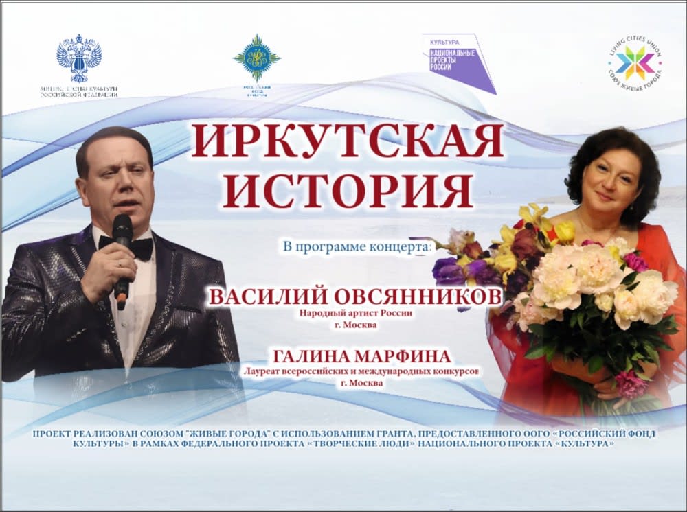 Цикл благотворительных концертов «Иркутская история», посвященный памяти советской певицы Лидии Руслановой, проходит в городах и селах Приангарья с 5 по 13 октября. В гастрольном туре участвуют народный артист России, певец Василий Овсянников и лауреат Всероссийских и международных конкурсов Галина Марфина.