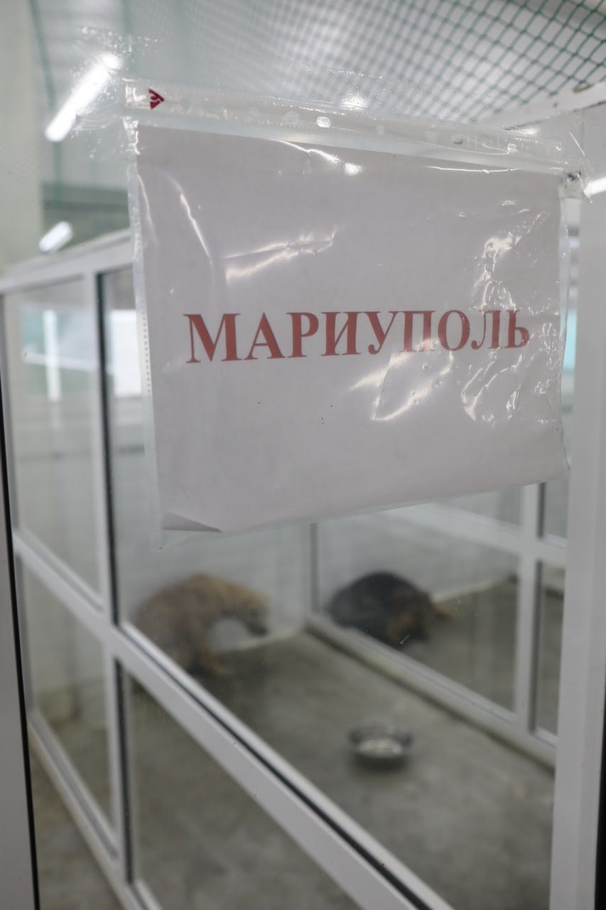 В частном секторе Мариуполя к волонтерам подбегают очень исхудавшие животные. Маленькая белая собачка, кажется, готова вместе с кормом съесть упаковку. Неподалеку от «Азовстали» на зов людей выходит черный метис дога. Хромая, он ковыляет к людям, спокойно дает обработать осколочное ранение в плече и позволяет забрать себя в дальнюю дорогу.