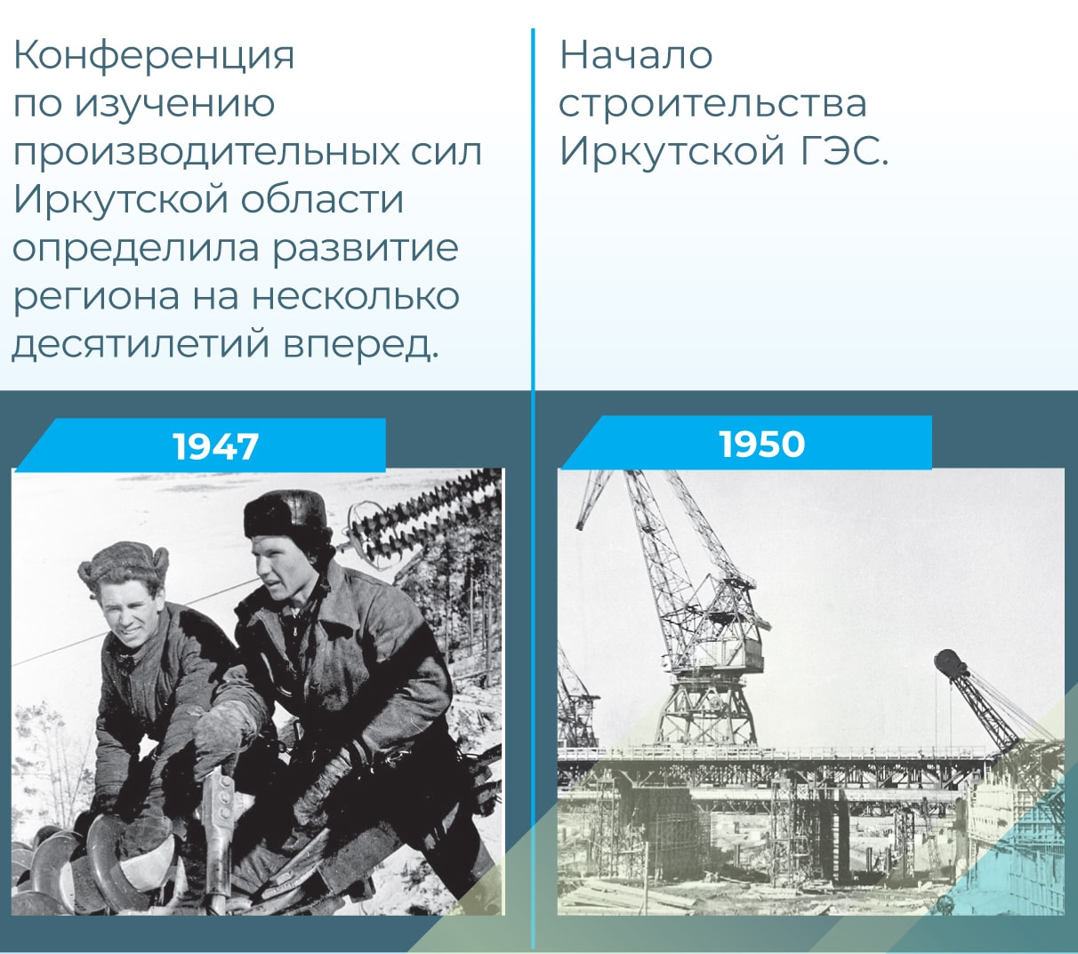 За тридцать лет, с 1950-го по 1980-й, в Иркутской области ударными темпами построены Иркутская, Братская и Усть-Илимская ГЭС, нефте-химический и электролизно-химический комбинаты в Ангарске; Братский, Байкальский и Усть-Илимский целлюлозно-бумажные комбинаты.