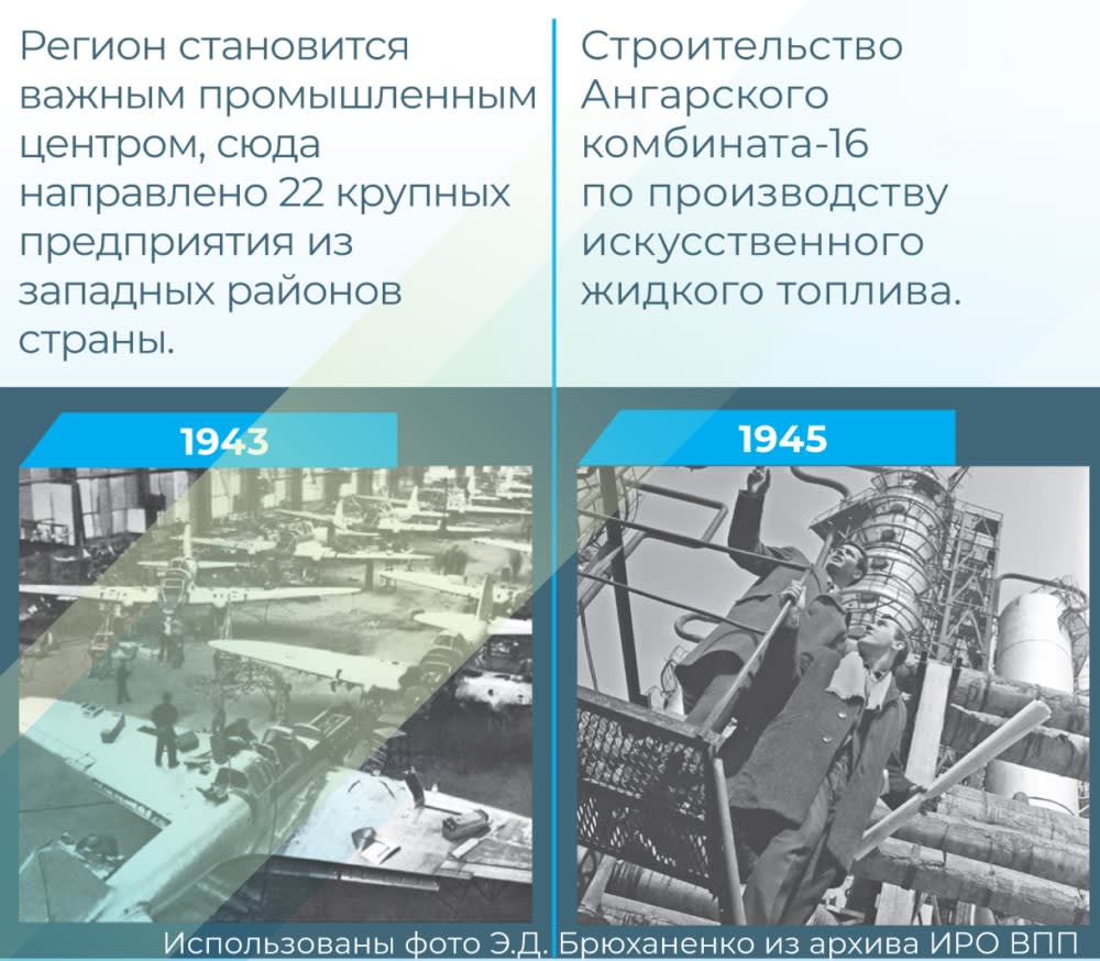 Из Иркутской области на фронт ушли 200 тыс. человек, и каждый второй из них погиб; еще более 30 тыс. умерли от ран и болезней в послевоенные годы. Иркутяне служили в прославленных частях и соединениях. В боях отличились воины 46-й стрелковой дивизии, 30-й Иркутской дивизии, 152-й стрелковой дивизии и 5-го мехкорпуса. Под Москвой стальной стеной встали сибирские дивизии: 93-я Восточно-Сибирская, 82-я мотострелковая, 116-я стрелковая, а также 78-я Дальневосточная, которой командовал Афанасий Белобородов. Под Сталинградом сражался 272-й стрелковый полк НКВД, сформированный на территории Иркутской области. Более 70 воинов-иркутян удостоены звания Героя Советского Союза. В годы войны Иркутская область становится важным промышленным центром Восточной Сибири. По плану Всесоюзного совета по эвакуации сюда направлено 22 крупных предприятия и десяток трестов и сырьевых баз, которые размещались в Иркутске, Черемхово, Усолье-Сибирском и Свирске. В Иркутской области выпускалось 50 наименований продукции оборонного назначения: самолеты, стрелковое оружие, минометы, гранаты, инженерное снаряжение, лыжи. Швейные и обувные фабрики шили обувь и одежду для Красной Армии, стекольные заводы готовили ампулы для лекарств. Макаронные фабрики и мясокомбинаты выпускали сухари, противотанковые бутылки с горючей жидкостью, сухой спирт, медикаменты и пищевые концентраты.