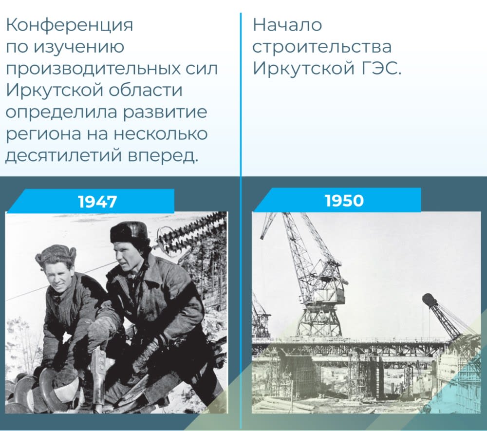 Развитие региона в послевоенное время определили решения конференции по изучению производительных сил Иркутской области, прошедшей в Иркутске в 1947 году. Было решено, что основой промышленной специализации Иркутской области должен явиться каскад гидроэлектростанций на реке Ангаре, а полученная энергия использоваться предприятиями цветной металлургии и лесохимической промышленности.