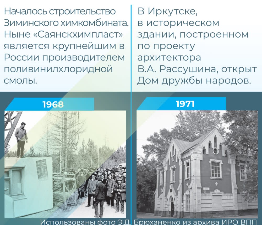Период советских «больших строек» завершается. Одной из последних комсомольских ударных строек в Иркутской области становится строительство в 1968 году Зиминского химического комбината. Ныне «Саянскхимпласт» является крупнейшим в России производителем поливинилхлоридной смолы, хлора и каустика.