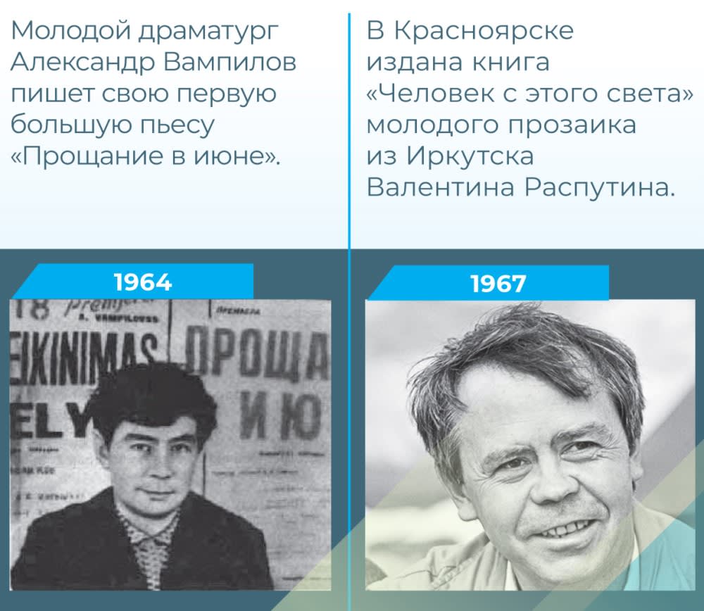 Бурное промышленное освоение региона нарушило патриархальный уклад старожилов Сибири. Ответом на конфликт между прошлым и будущим стал поиск нового нравственного идеала. В 1964 году молодой драматург Александр Вампилов пишет свою первую большую пьесу «Прощание в июне». Творчество Александра Вампилова оказало огромное влияние на драматургию 1970–1980-х, а его пьесы и сейчас в репертуаре ведущих театров России.