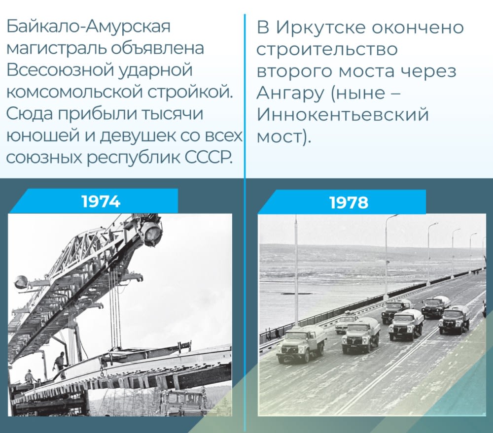 В 1974 году Всесоюзной ударной комсомольской стройкой была объявлена Байкало-Амурская магистраль. Несмотря на то что первые участки магистрали строились с 1932 года, в основном БАМ строился в период с 1972 по 1984 годы. Строители шли навстречу друг другу: от Тайшета до Тынды и от Тынды до Ванино. «Золотое звено», соединившее центральный и восточный участки, было уложено 1 октября 1984 года на станции Куанда, однако Северомуйский тоннель, самый длинный в России, сдан в постоянную эксплуатацию только в декабре 2003 года. Вдоль БАМа в Усть-Кутском и Казачинско-Ленском районах возникли новые поселки: Звездный, Ния, Магистральный, Улькан, Кунерма.