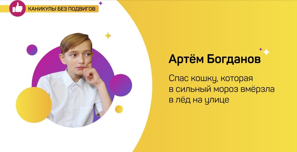 Артём Богданов из города Усть-Кут спас кошку, которая примерзла лапками ко льду. Кошка, очевидно, грелась в мороз под машиной, а когда автомобиль остыл, оказалась в плену и не смогла сдвинуться с места. Мяуканье кошки услышала мама Артёма, возвращаясь с работы. Она постаралась найти животное, но во дворе было темно, и обнаружить кошку ей не удалось. Зато дома был Артём, который поспешил на помощь: принёс бутылку с теплой водой, по звуку нашёл кошку и отогрел животному лапки. Через несколько минут кошка была свободна. Артём отнёс её в приют.