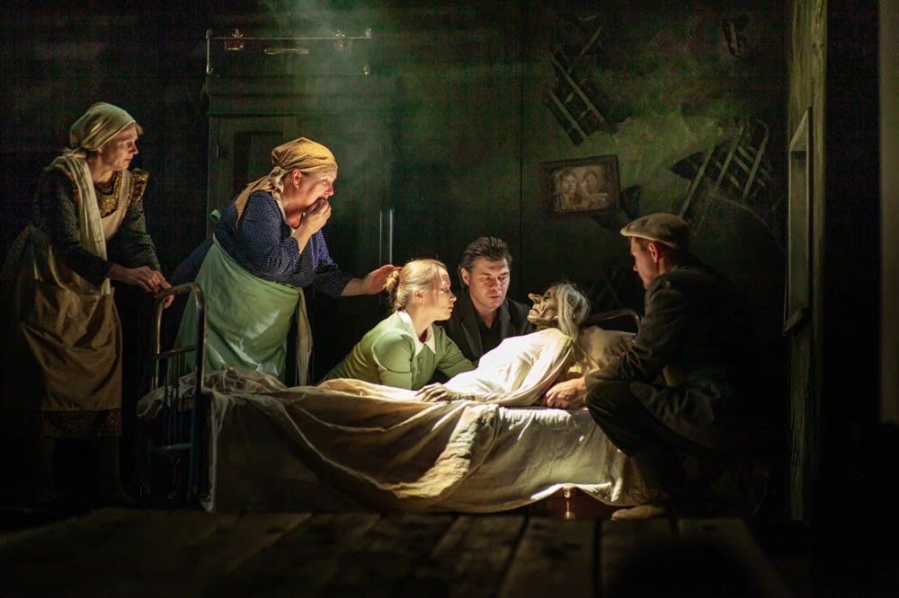 В спектакле задействовано более десяти планшетных кукол. Кукла главной героини – старуха Анна – исполнена с механикой глаз и рта. Ею, как и куклой Миронихи, управляют артисты, которые также исполняют роли ее детей: Варвары (Наталья Уткина), Люси (Диана Бронникова), Михаила (Эдуард Дроздов) и Ильи (Роман Зорин). Этот же ансамбль героев управляет Миронихой, только в данном случае солирует Тамара Гуринович, голосом которой и говорит персонаж. Роль Надежды исполнила Надежда Светлова, Степана – Денис Игнатьев.
