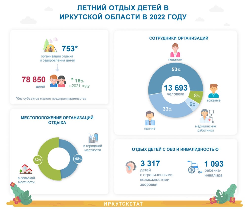 По информации Иркутскстата, этим летним в детских лагерях Иркутской области отдохнули 78 850 детей, это на 16% больше по сравнению с 2021 годом. Значительную часть побывавших в детских лагерях составляют дети из Иркутска (13%) и Ангарского городского округа (12%). Работало 753 организации отдыха и оздоровления детей, из них 52% – в сельской местности. Из общего числа лагерей 7 – палаточного типа, в них провели часть летних каникул 1 375 детей.