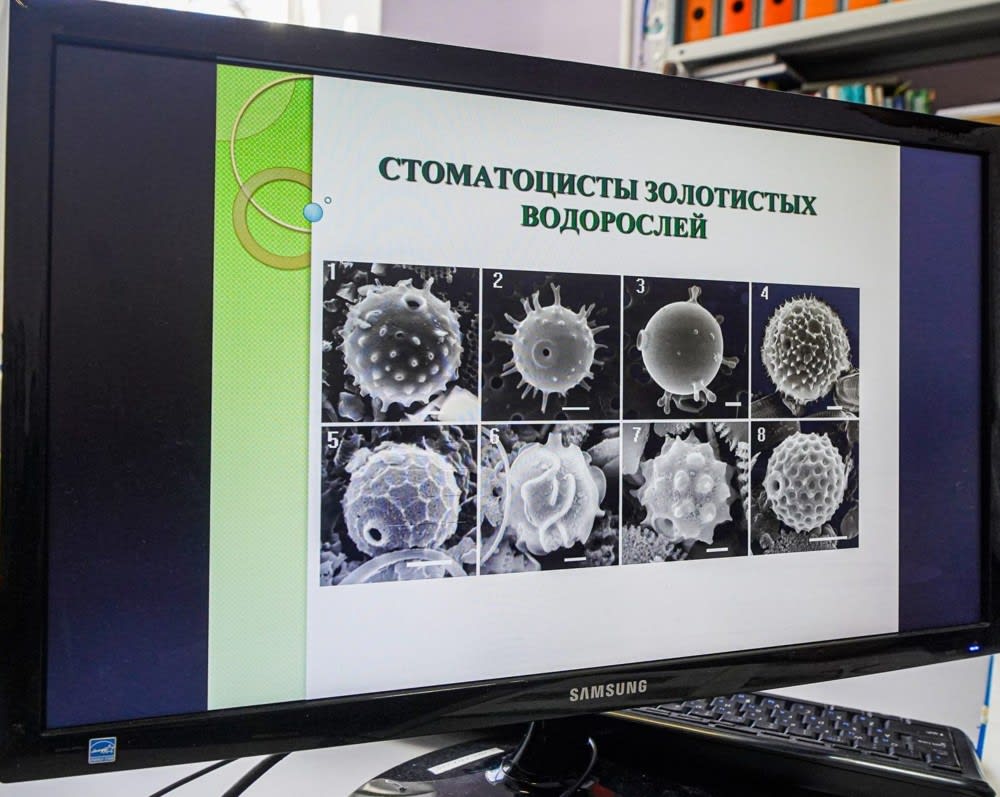 Старший научный сотрудник Алена Фирсова изучает хризофитовые, т.е. золотистые водоросли. Их микромир тоже живописен. Эти водные растения образуют колонии и т.н. стоматоцисты различной формы с защитными оболочками, которые по аналогии с диатомеями сохраняются много лет. Одни похожи на шишки, другие – на плафоны, третьи – на ландыши. Увидеть эту красоту, описать виды, и эффектно проиллюстрировать научные статьи позволяет только электронная микроскопия.