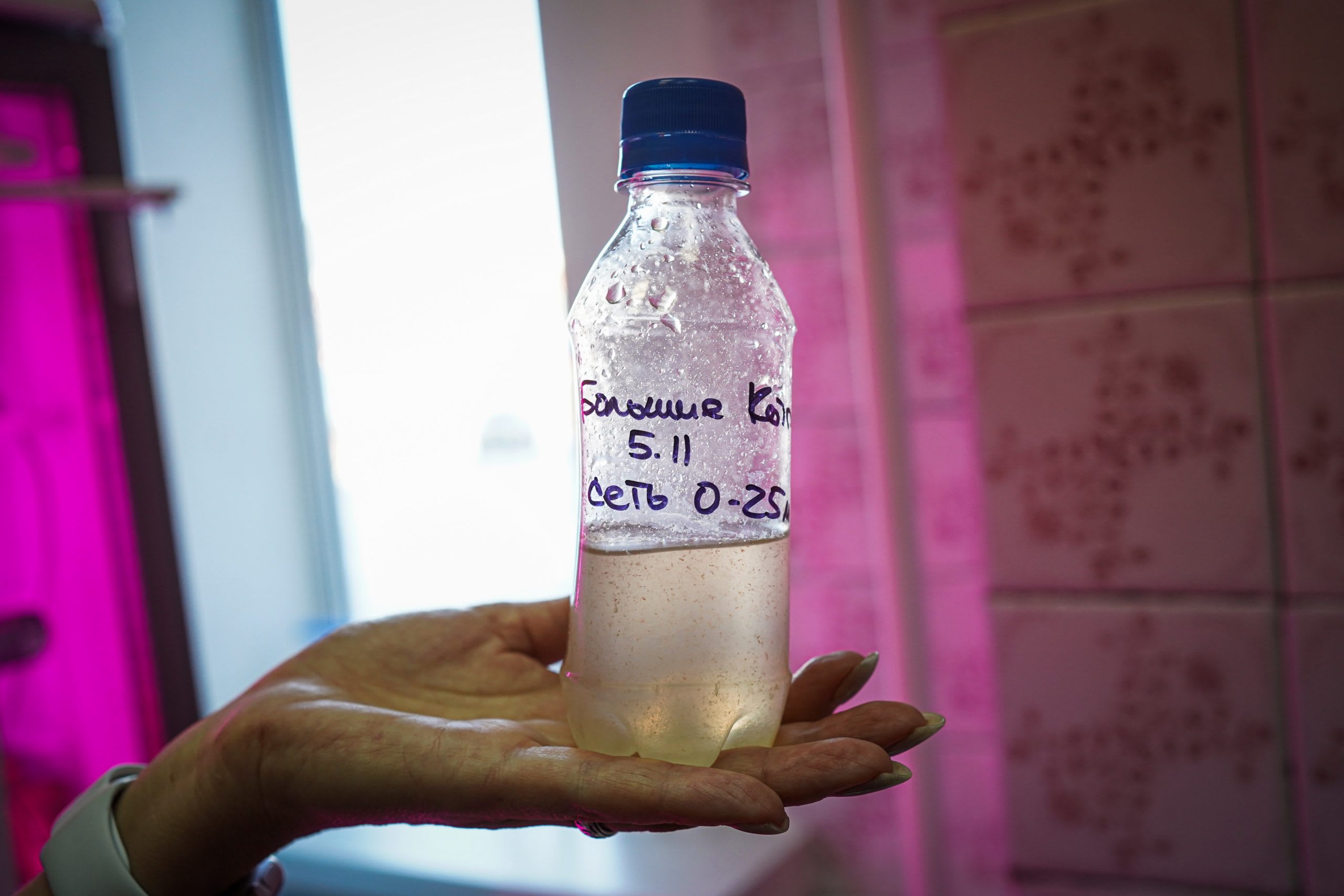 – Когда образцы привозят с Байкала, их сначала ставят на адаптацию в месте с естественным освещением, – поясняет кандидат биологических наук, руководитель группы Юлия Захарова. – В бутылочке то, что мы поймали в Больших Котах при помощи сети, которая имеет диаметр ячеек 20-25 микрон. Для отбора проб из фотического слоя, то есть – куда проникает – необходимый для развития диатомей солнечный свет – мы погружаем планктонную сеть на глубину 25 метров. И она при поднятии вверх профильтровывает огромное количество воды для получения 50 миллилитров пробы с биомассой планктона.