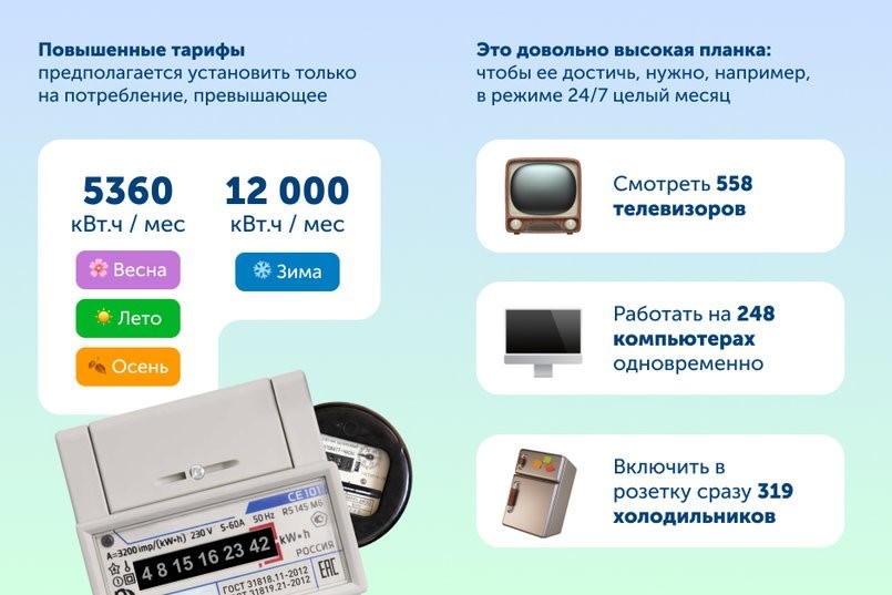Это высокая планка. Чтобы достичь 12000 руб/кВт.ч, нужно, например, 24/7 целый месяц смотреть 558 телевизоров, работать на 248 компьютерах одновременно или включить сразу 319 холодильников. Среднее энергопотребление домохозяйства в Иркутской области составляет около 400 кВт.ч в месяц, а 98% домохозяйств потребляют не более 2000 кВт.ч в месяц.