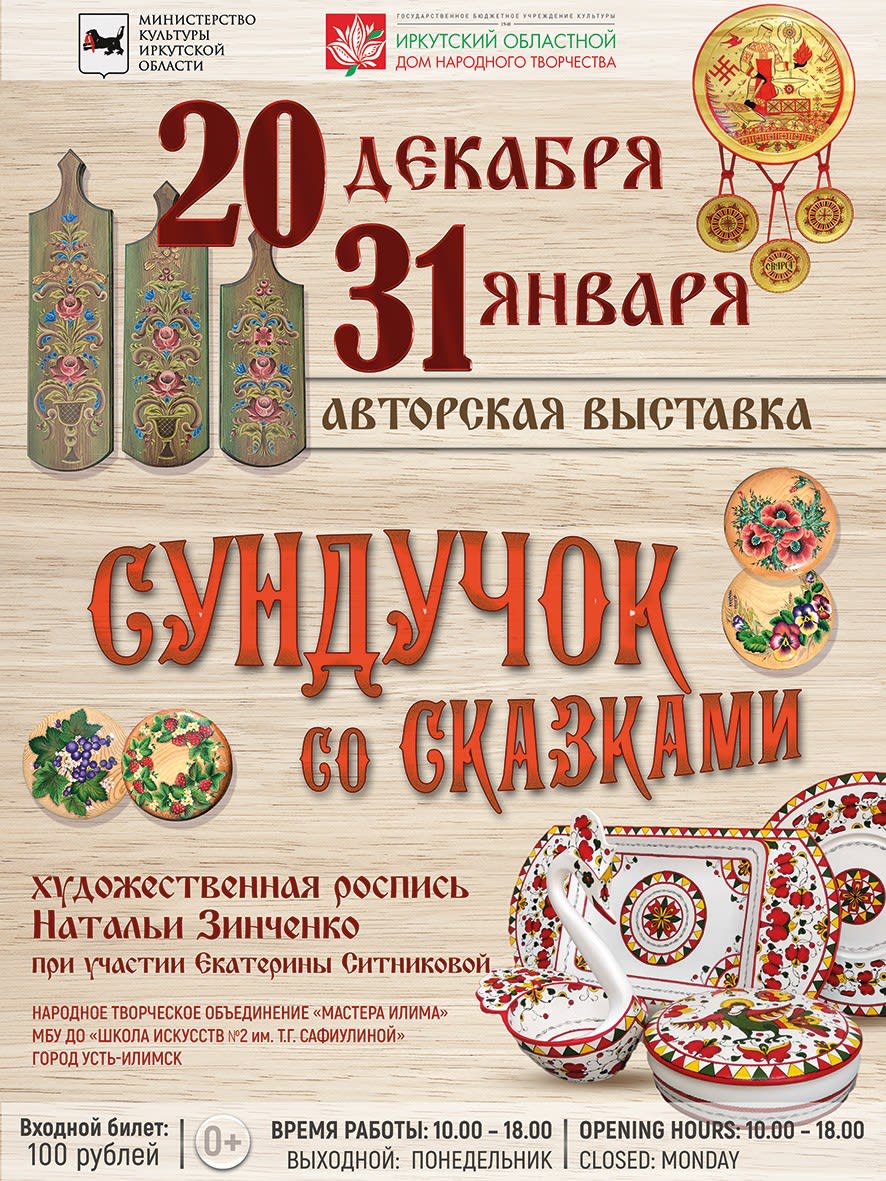 Авторская выставка «Сундучок со сказками» откроется в Ремесленном подворье 20 декабря в 15:00. На выставке будут представлены деревянные расписные изделия в различных техниках. В первые дни работы выставки посетителей ждут мастер-классы по росписи елочных игрушек. Об этом 19 декабря 2022 года сообщает пресс-служба Иркутского Дома народного творчества.