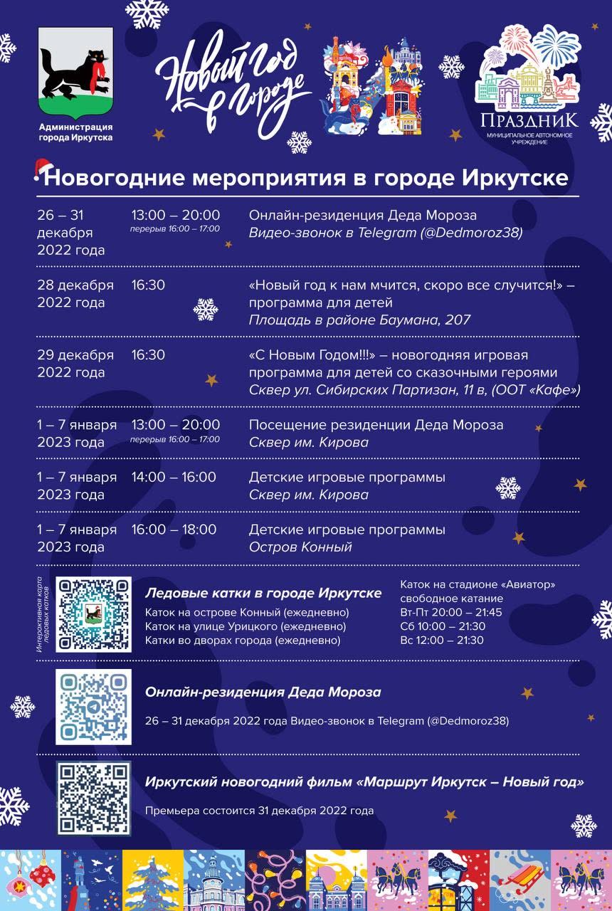 Для жителей Иркутской области подготовили праздничную программу на январские выходные с 1 по 7 и предновогодние дни. Для посещения иркутянам открыта резиденция Деда Мороза, а также игровые детские программы со сказочными героями. Мероприятия пройдут на сквере Кирова и двух других площадках. Об этом 28 декабря 2022 года сообщает администрация Иркутска.