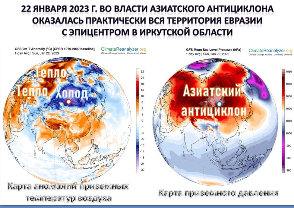 В Иркутске в первой декаде месяца после выхода атлантического циклона 10 января отмечалось повышение дневных температур до −3°С, что на 11 градусов выше многолетних значений, затем пришел мощный заток холода с понижением 13 января дневных температур до −22°С, ночных до −32°С, что на 9 градусов ниже многолетних значений. 18 января накануне Крещения очередной атлантический циклон вынес порцию тепла с ослаблением январских морозов на 10 градусов. Однако уже 19 января в Крещение из-за вторжений арктического холода с моря Лаптева, Восточно-Сибирского моря и Якутии во власти Азиатского антициклона оказалась практически вся территория Евразии: от побережья Испании на западе до Аляски на северо-востоке, по югу его гребни достигли территорий Пакистана и юга Китая. Причем центр Азиатского антициклона на картах погоды был в Иркутской области, именно поэтому жители нашего региона оказались не только в эпицентре арктического холода, но и очень высокого атмосферного давления, – ответила эксперт.