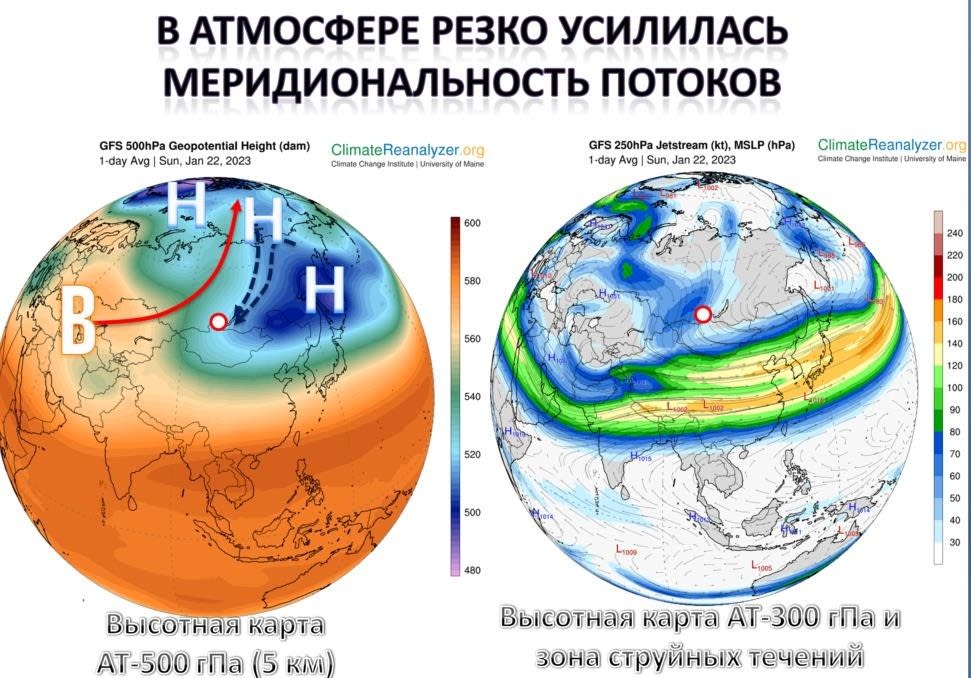 В свою очередь активность атлантических и южных циклонов была вызвана затоками холода с Гренландии. Благодаря такой непростой картине в распределении ветровых потоков значительная часть Сибири, Якутии, Дальнего Востока, Монголии и даже Китая оказались во власти нисходящих движений холодного воздуха с высот стратосферы, которые усилили Азиатский антициклон и привели к формированию аномальных морозов.