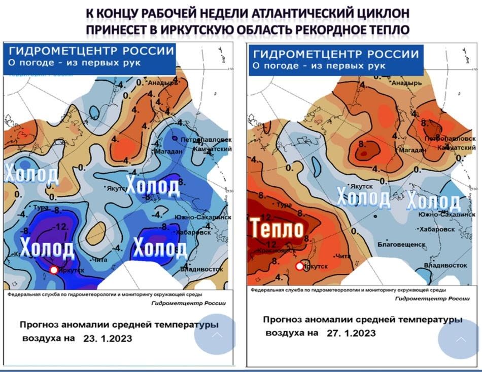 — К концу рабочей недели по прогнозу Гидрометцентра России атлантический циклон принесет в Иркутскую область рекордное тепло, примерно до −6-10°С в дневные часы с понижением атмосферного давления и выпадением снега, которого, кстати, уже сейчас выпало больше месячной нормы