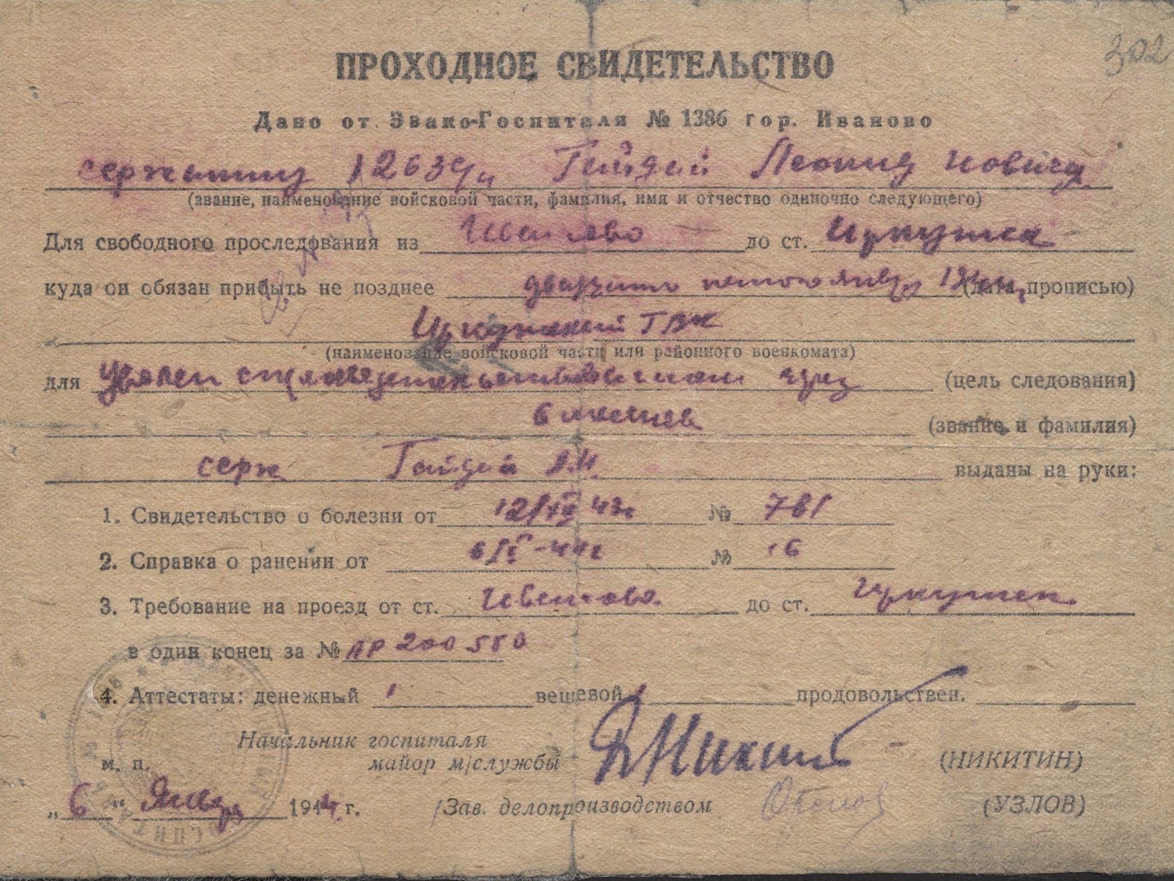 Из письма брату Александру Гайдаю: «Я и другие ребята, с которыми служил на Востоке, твердо решили идти в разведчики. Романтика! Так я был зачислен во взвод пешей разведки рядовым 1263-го стрелкового полка 381-й стрелковой дивизии. Снова эшелон, короткий период учебы в лесу под Можайском и – на фронт. К тому времени нашими войсками уже был освобожден Калинин. Наша дивизия вошла в третью ударную армию. С ноября 1942 года для меня и моих товарищей начались фронтовые будни. Еженощный поиск, охота за «языками».