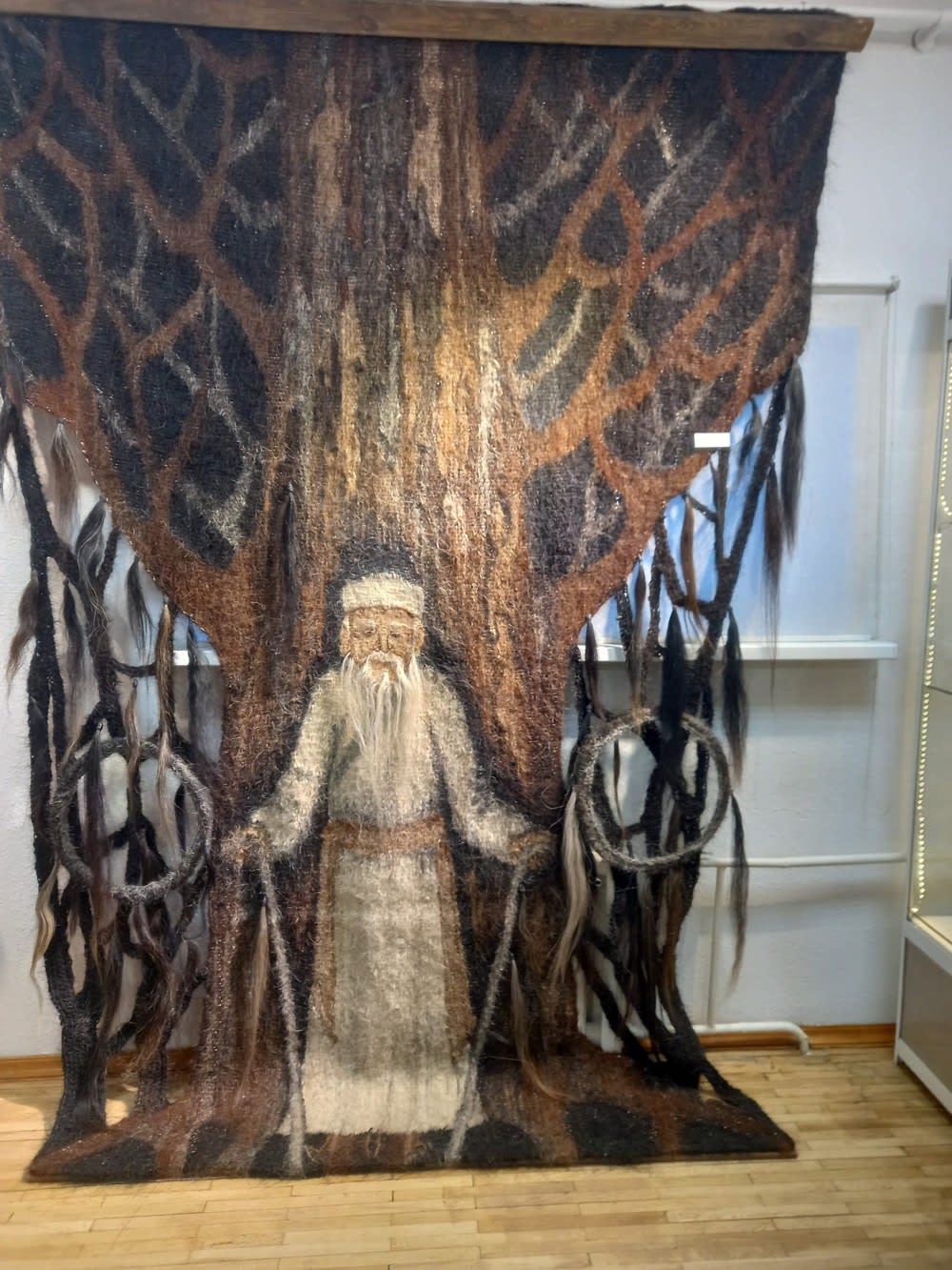 На него и Нижнего миров стильный гобелен «Белый старец»), пейзажные работы. Центральные образы работ связаны с национальной символикой, поклонением земле и природе, наполнены тихой, естественной красотой.