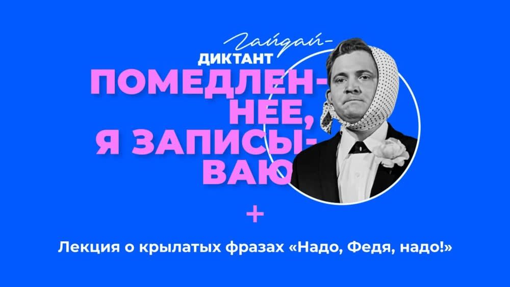Гайдай-диктант «Помедленнее, я записываю» пройдет в библиотеки им. Молчанова-Сибирского 11 февраля с 15:00 до 17:00. Участникам предстоит написать необычный текст, в котором будут спрятаны цитаты из фильмов Леонида Гайдая. Задача – вычислить все крылатые фразы и правильно определить, из каких они фильмов. Для участия на площадке Молчановки необходима предварительная регистрация.
