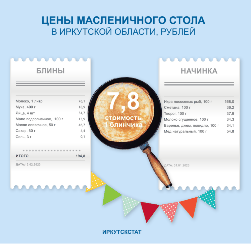 Блины в Иркутской области обходятся дороже в 2023 году в сравнении с соответствующим периодом прошлого года. Их стоимость составляет 195 рублей, на один блинчик приходится около 8 рублей. Об этом 20 февраля сообщает Иркутскстат.