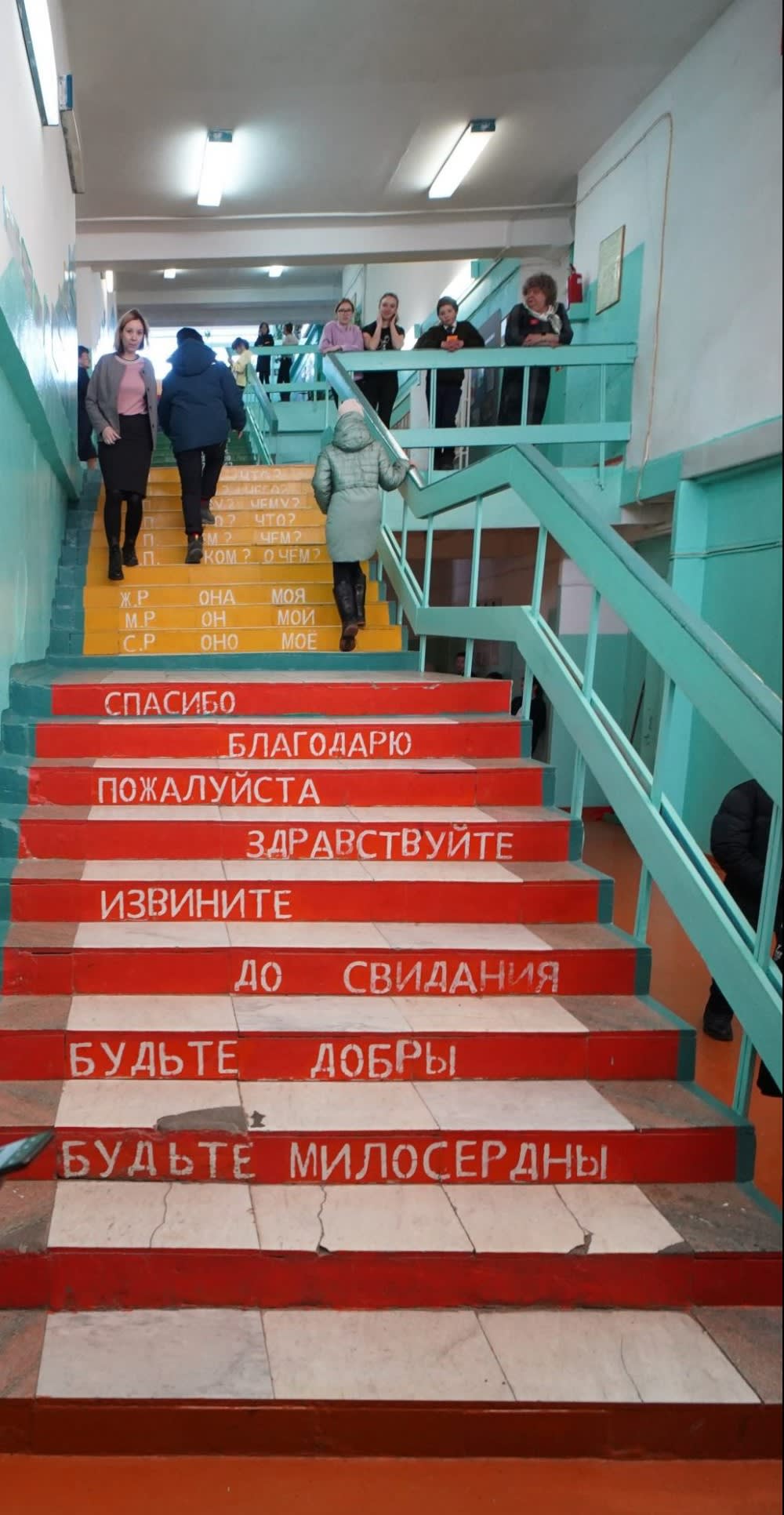Блок начальной школы – одноэтажный. Если посмотреть на здание с другой стороны – в нем уже три этажа, а со стороны стадиона – пять. Чтобы украсить длиннющую лестницу, решили на ступеньках написать таблицу умножения, падежи, правописание вежливых слов – благо расстояние позволяло. С тех пор эти надписи обновляем ежегодно. А над лестничными пролетами силами родителей и учеников появились картины. Так родился социальный проект «Школа – наш дом».