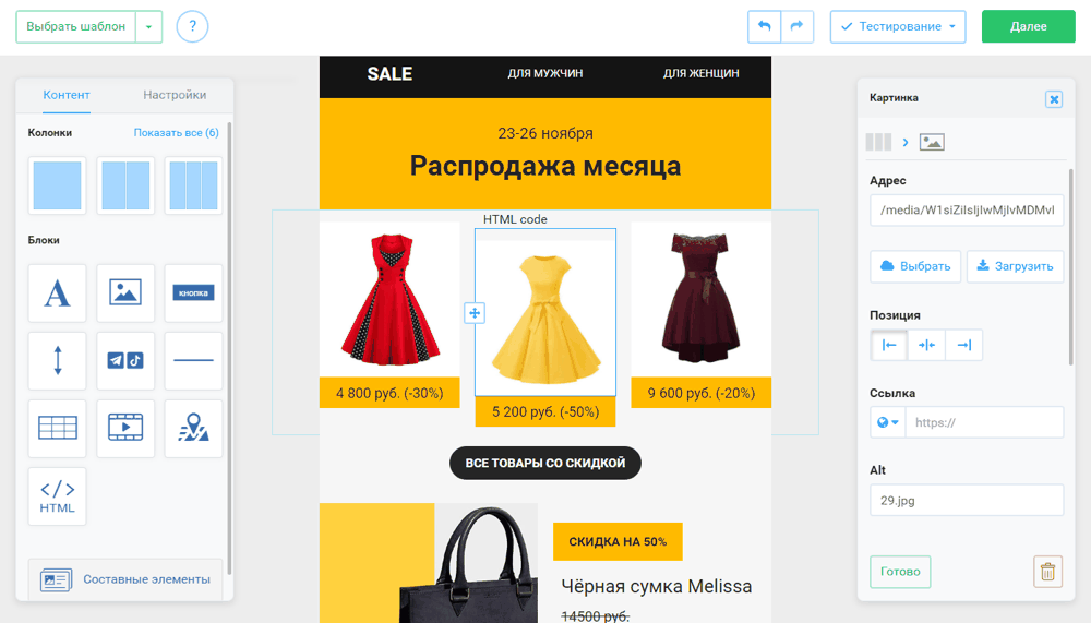 Кроме того, с блоками можно работать отдельно – редактировать их и даже создавать. Вашему вниманию инструменты для персонализации письма. Например, хорошо работает обращение по имени. Данные при этом можно брать из конкретных полей в базе.