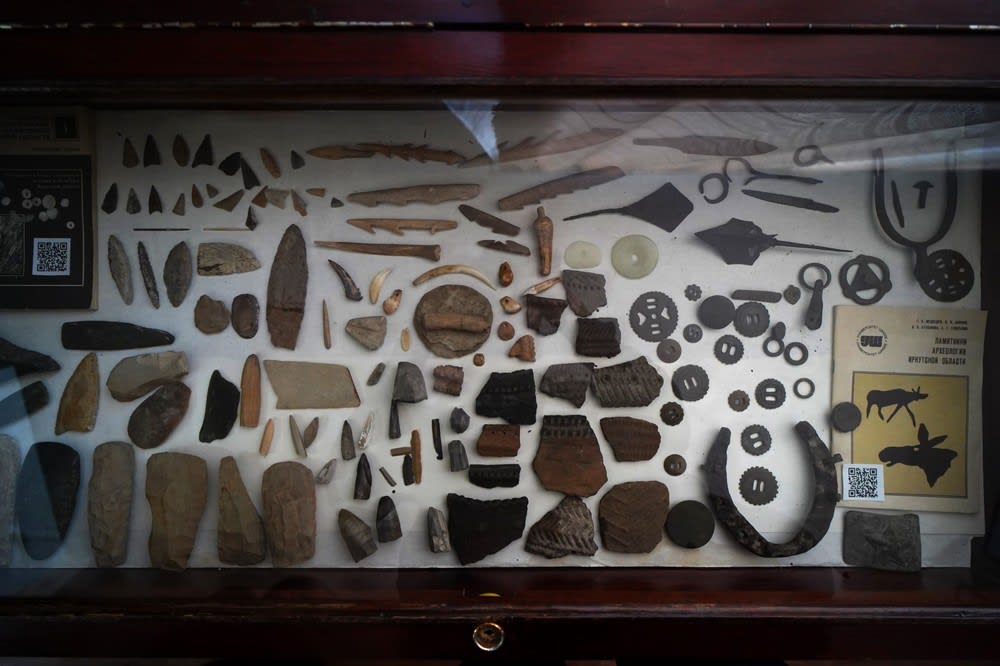 В музее хранятся черепа предков, живших на берегах Ангары и Белой 5–6 тыс. лет назад, окаменелые останки доисторических животных, орудия труда первобытного человека, нефритовые кольца, охотничьи амулеты.