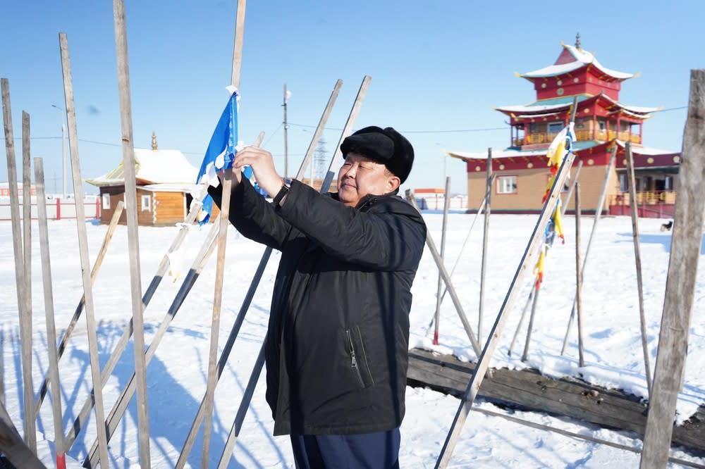 На территории дацана гости совершили обряд запуска «коней ветра удачи» – вывешивали синие флажки Хий Морин Сан. Это символ, показывающий состояние благополучия человека.