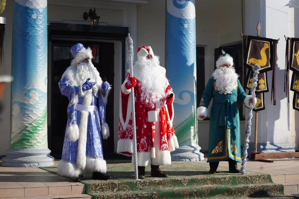 Праздник продолжился в концертном зале «Эрдэм». Перед входом был разожжен очистительный костер. К запахам сырого ветра – предвестника весны – подмешивался запах жженого чабреца. Гостей встречали три Деда Мороза, среди которых были русский и татарский сказочные персонажи. Они с почтением передали бразды правления бурятскому Белому старцу, символу Сагаалгана.