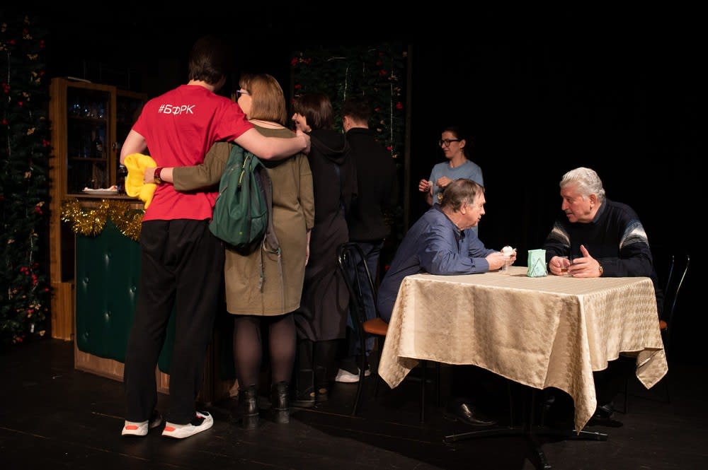 Действие постановки, сценографию к которой также придумал режиссер, заслуженный артист РФ Геннадий Гущин, разворачивается в баре в канун Нового года среди мишуры и гирлянд.
