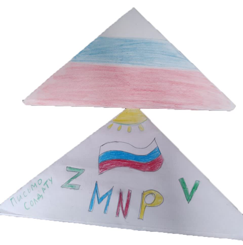 С собой казак вез ценный груз – письма кадетов шелеховской школы. Руслан отмечает, что детские письма для бойцов – самое ценное. Он показал нам фото: два бумажных треугольника, один раскрашен в триколор, второй с надписями «Письмо солдату» и «Мир».