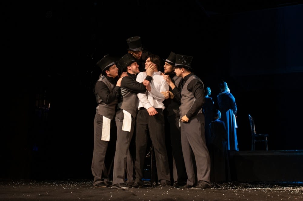 Постановка наполнена метафорами, которые помогают нам раскрыть характеры героев и их взаимоотношения. Например, Кирсанов-старший (Артем Довгополый) играет на своей молодой любовнице Фенечке (Алена Бочкарева, Ольга Гарагуля), как на виолончели. Голая спина девушки и поднятая вверх коса – гриф в темноте сцены смотрятся очень эффектно.