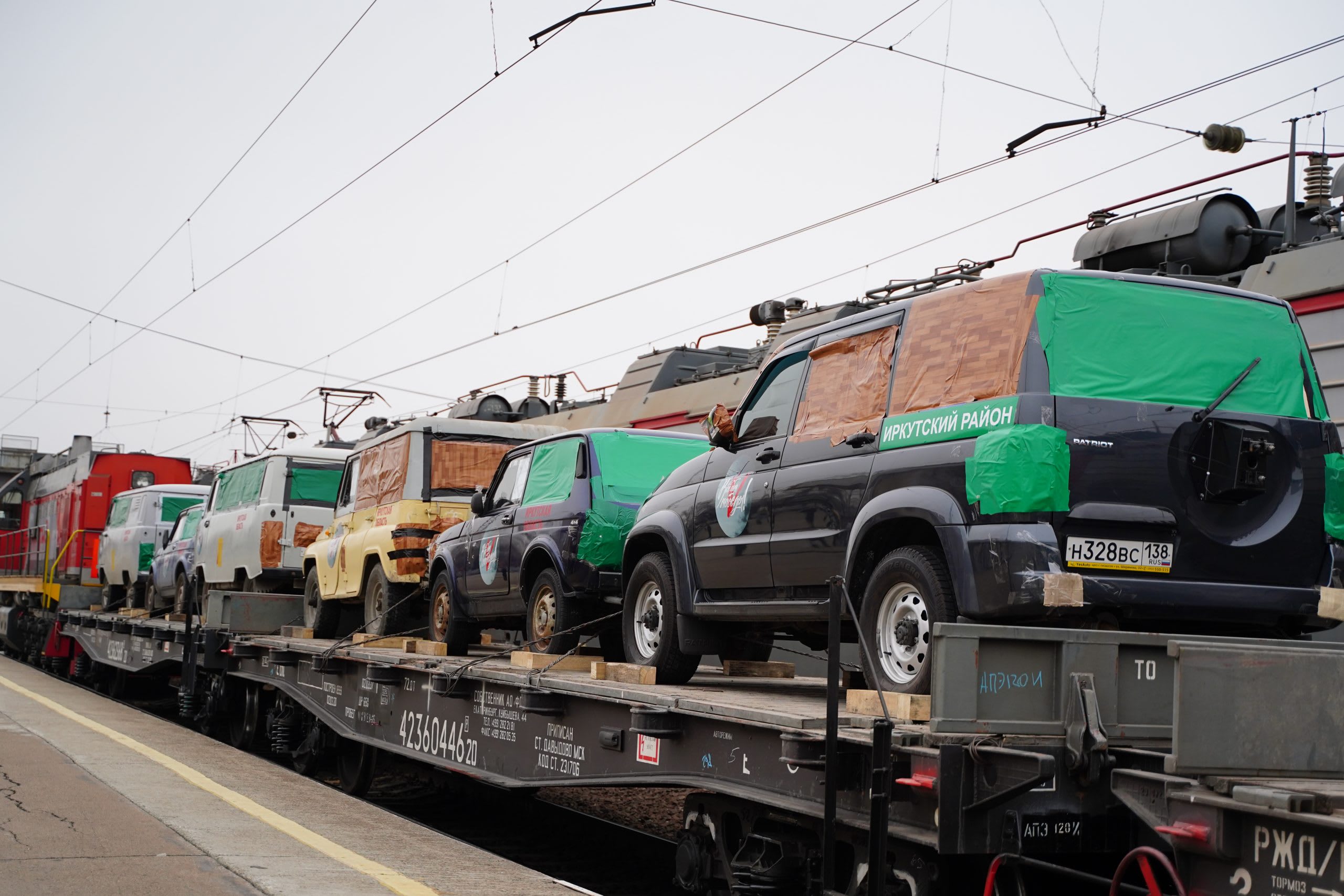 Автомобили высокой проходимости, прицеп и горный мотоцикл отправили на передовую специальным поездом 12 апреля. Всего в эшелон было погружено 28 единиц техники высокой проходимости – так жители Иркутской области поддержали акцию «Народного фронта» «Автопоезд».