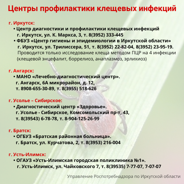 В Иркутской области с начала эпидемического сезона в лечебно-профилактические учреждения за медицинской помощью по поводу укусов клещей обратилось 62 взрослых и 33 ребенка. В 2022 году на этот период от укусов клещей пострадали 275 жителей области. Об этом 21 апреля 2023 года сообщила пресс-служба регионального Роспотребнадзора.