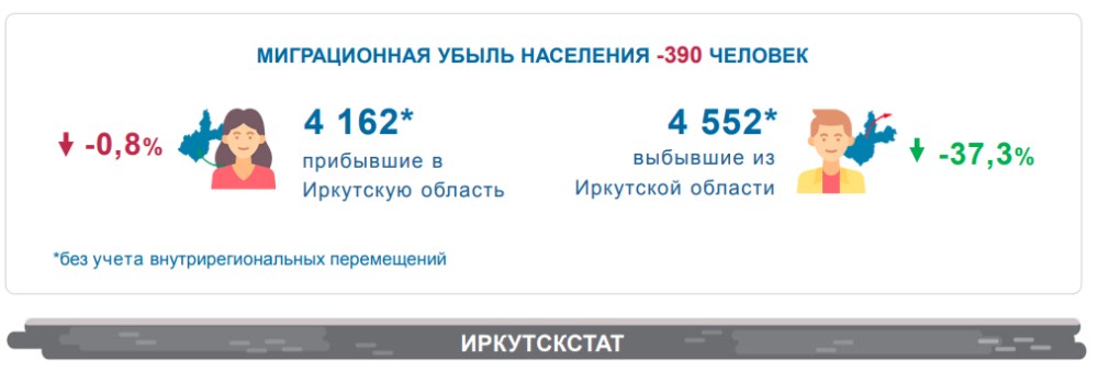 За 3 месяца в Иркутскую область из других регионов России и зарубежных стран прибыли 4,2 тыс. человек, выбыли – 4, 6 тыс. человек.