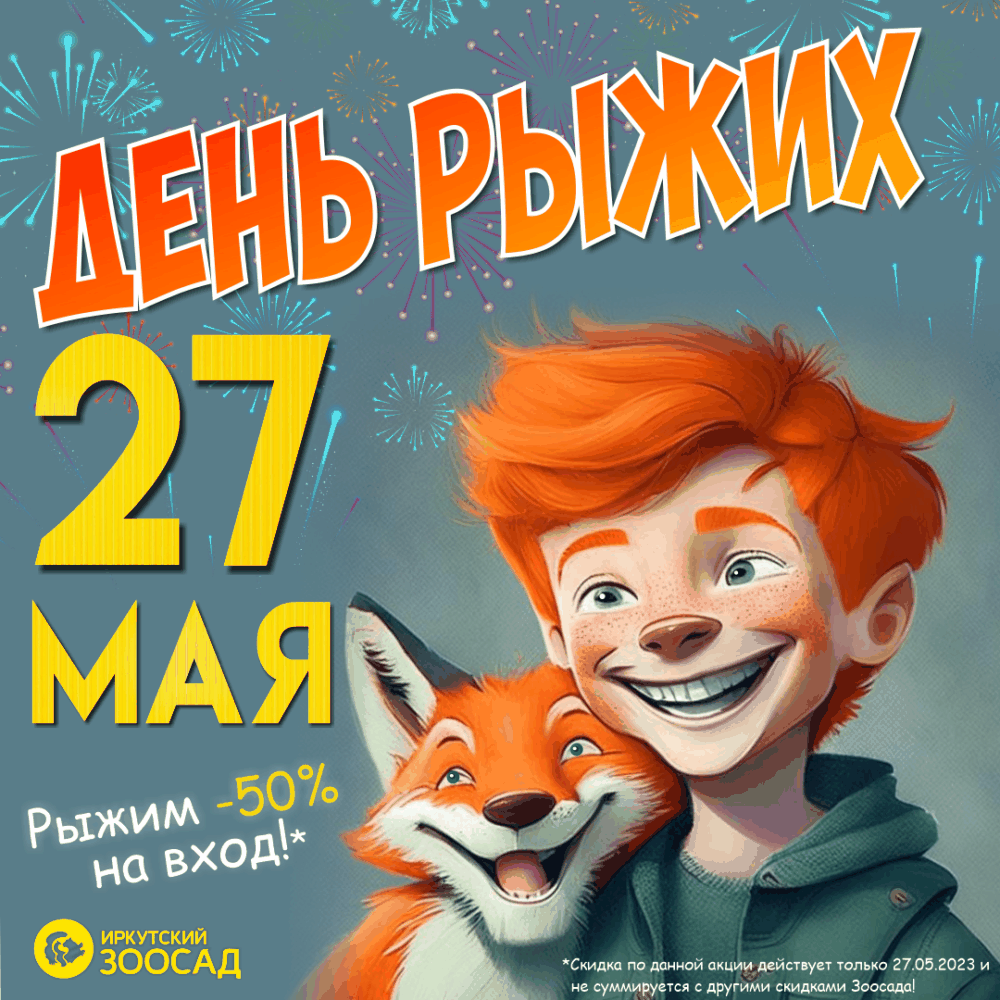 - В Иркутском зоосаде (ул. Кольцова, 93) будут отмечать Всемирный День Рыжих, все рыжие в этот день получают скидку 50% на входной билет. Гостей ждут тараканьи бега, показательные кормления лис и пятнистых оленей, а также анимационная программа. Начало в 13:00.