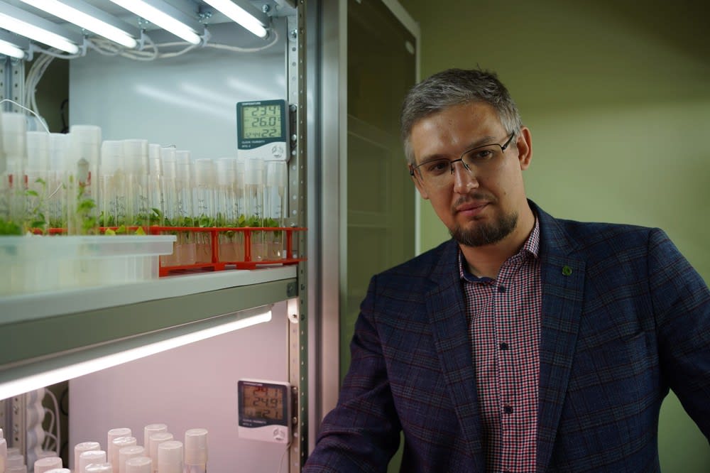 Василий показывает две пробирки с тополями, высадили их в один день. Только один – обычный, а рой – генно-модифицированный организм. У него изменен биосинтез гормонов роста, поэтому этот «акселерат» примерно в три раза больше своего собрата. Ученый берет с полки третью емкость, только деревце в ней совсем маленькое, тоже трансгенное, но в этом случае генетики рост тополька замедлили.