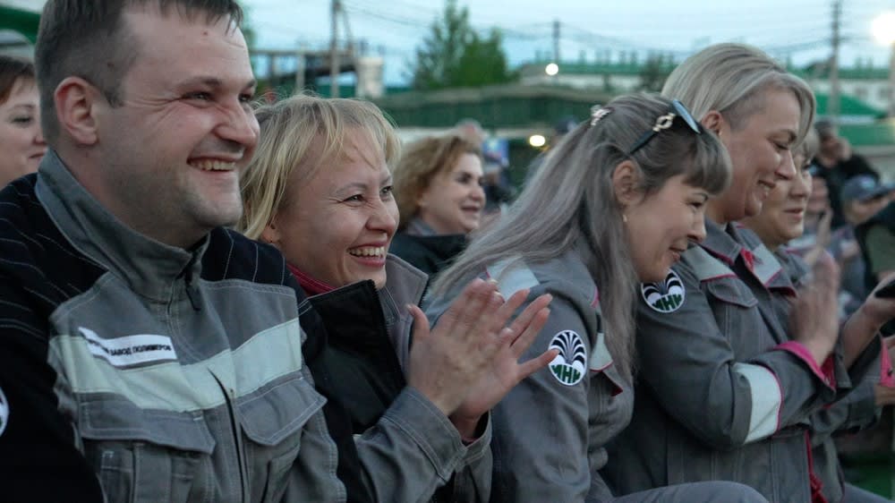 Затем начался концерт для нефтяников на открытом воздухе. На надувной сцене! Работать гостям пришлось в экстремальных условиях: погода резко испортилась, налетел ветер, выключился свет, и сцена сдулась у всех на глазах. Но актеры не растерялись: они продолжили свои номера, импровизируя на ходу. Концерт прошел на одном дыхании. Зрители пели вместе с Аленой Биккуловой «Подмосковные вечера», задавали вопросы Олегу Харитонову, были очарованы Алексеем Барабашем. Ольга Хохлова в буквальном смысле «зажгла» сердца присутствовавших: вместе с ней они исполняли частушки и танцевали кадриль.