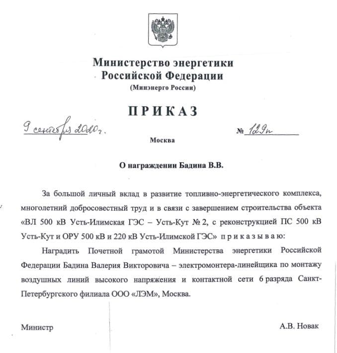 Про таких, как Валерий Викторович Бадин, говорят, что они в своей профессии до мозга костей. Сорок лет он занимается электросетевым строительством – строит линии электропередачи и электрические подстанции. В выбранной им профессии для него уже не осталось секретов, он может организовать производственный процесс на любом из его этапов – от рытья котлованов и установки фундаментов до сборки и установки опор до монтажа провода и грозозащитного троса. С 1992 года Валерий Викторович имеет высший шестой разряд электромонтера-линейщика, более 30 лет работает бригадиром. В сентябре 2020 года Валерий Викторович был награжден Почетной грамотой Министерства энергетики Российской Федерации за большой личный вклад в развитие топливно-энергетического комплекса страны и многолетний добросовестный труд.