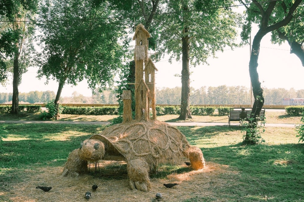 – Мне приходилось много импровизировать. Во время фестиваля поняла, что солома – это трудоемкое ремесло. Для ускорения процесса из электродов сделали большие иголки. Это позволяло быстрее крепить природный материал с помощью веревки, – поделилась опытом Ольга Морозова из Омска. Благодаря ей в парке появилась огромная черепаха, на панцире у которой возвышаются дома. По замыслу автора, дом – это вовсе не стены, а мир внутри нас, это то, что нас защищает, где бы мы не оказались.