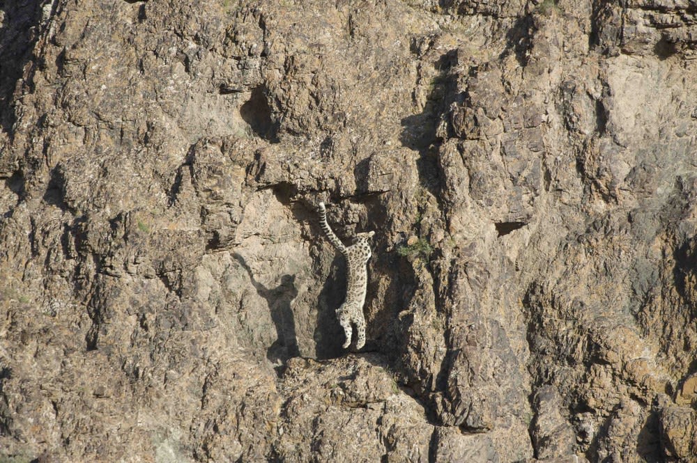 В тот день, точнее вечер, Фортуна продолжала баловать фотографа. Вместе с проводником по имени Угна Малеев кинулся за исчезнувшим было среди камней зверем и практически напоролся на него. «Поднимаю голову – прямо передо мной в семи–восьми метрах, распластавшись в углублении скалы, лежит барс! Не понимая, что делать, в растерянности оборачиваюсь к Угна и вижу, как он прыжками несется в гору, уже в сотне метров от меня. Ноги подкосились, и я упал на колени. В какой-то момент зверь резко поднялся, я замер, до боли сжав в руках штатив и камеру. Единственная мысль: «Неужели это все?» Увлекшись погоней, Малеев схватил только камеру с 500-миллиметровым объективом. Поэтому пришлось отскочить назад, чтобы хватило фокусного расстояния, и снял крупный портрет горного красавца. Когда все утряслось, проводник Угна сделал вид, что не струсил, оказавшись в нескольких шагах от зверя, а побежал за другим фотоаппаратом и подходящей оптикой.