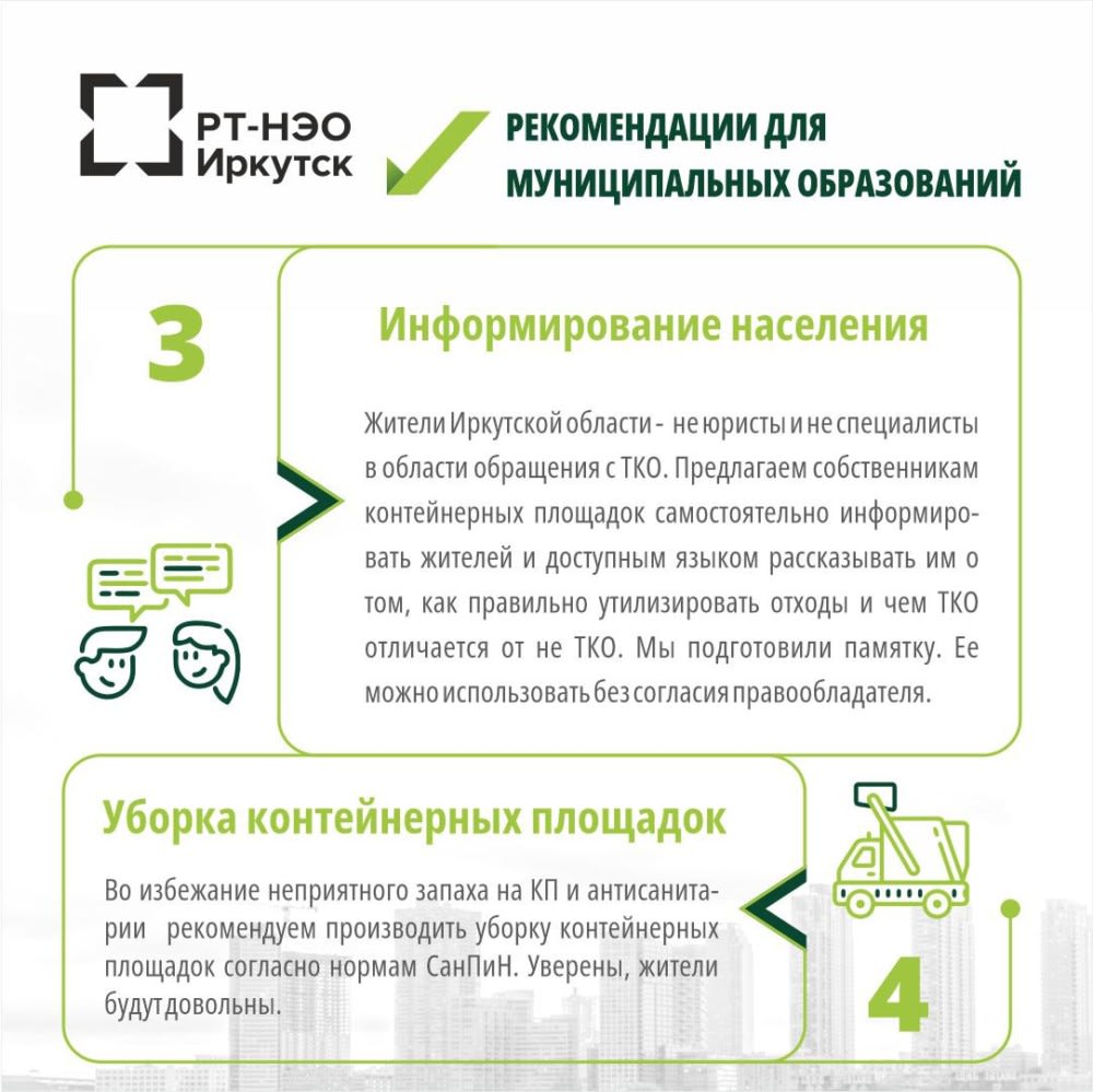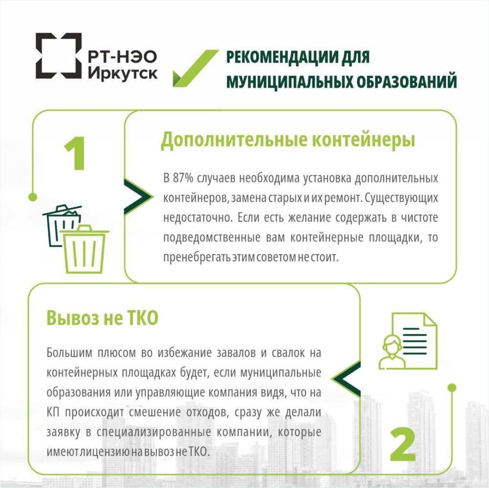 !Законодательство обязывает, а «РТ-НЭО Иркутск» рекомендует муниципалитетам и управляющим компаниям внимательно отнестись к главным факторам, из-за которых происходит срыв графика вывоза ТКО, завалы на контейнерных площадках и грязь.