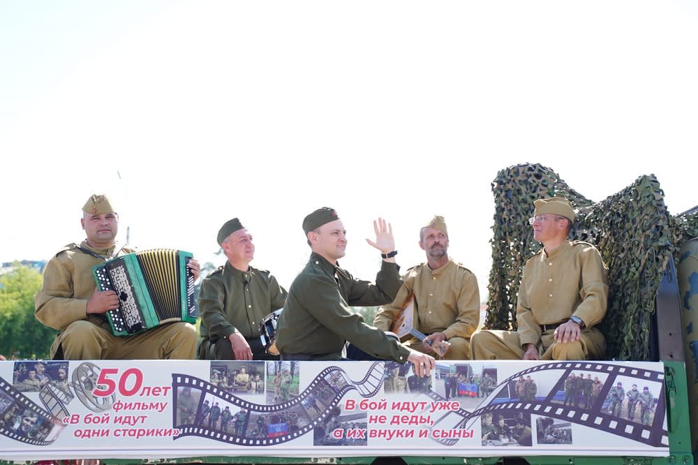 Сотрудники агрохолдинга «Саянский бройлер» шествовали в футболках с патриотическими лозунгами и в нарядах в стиле героев фильма «В бой идут одни старики», которому в этом году исполняется 50 лет. Работники предприятия подчеркнули, что сейчас на фронте подвиги своих дедов повторяют их внуки, им сейчас очень нужна поддержка.