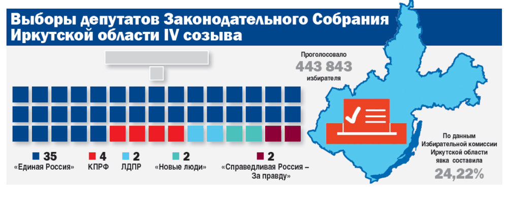 Четвертый созыв Законодательного Собрания Иркутской области будет многопартийным. По итогам трехдневного голосования необходимый по закону пятипроцентный барьер преодолели «Единая Россия», КПРФ, ЛДПР, «Справедливая Россия – За правду» и «Новые люди». Избирательная комиссия региона, федеральные эксперты и общественные наблюдатели сходятся во мнении, что выборы в регионе прошли без нарушений, их можно признать состоявшимися и легитимными.