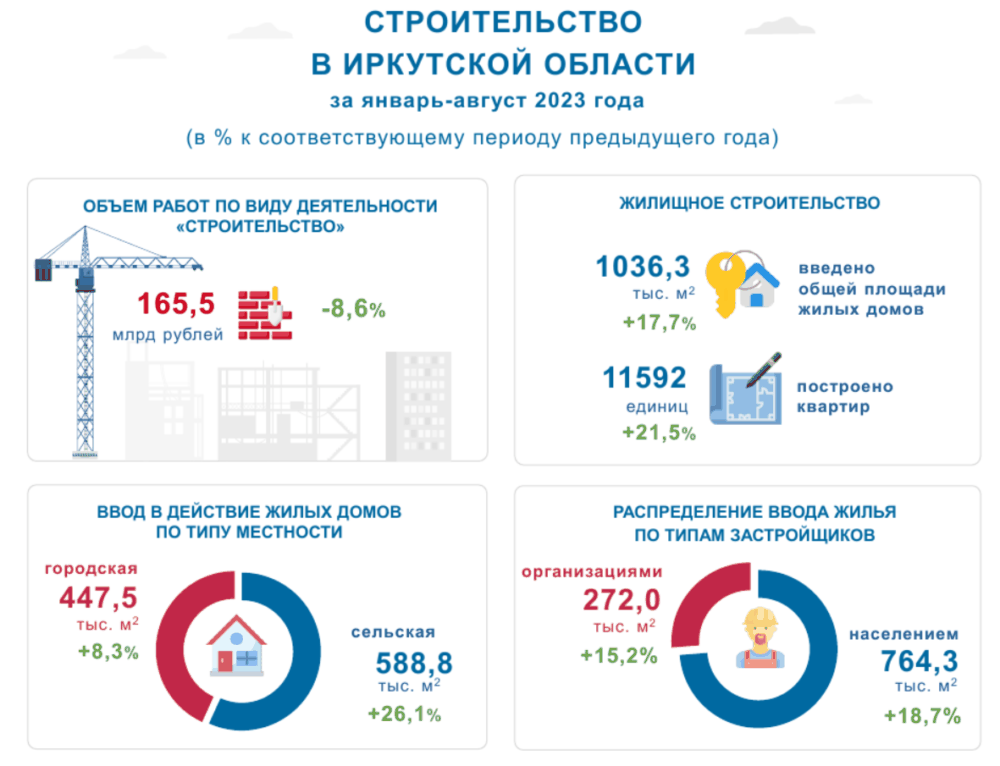 Объем жилищного строительства в Иркутской области вырос на 18% и составил 1036 тыс. кв. м. С начала 2023 года сдано под ключ 11 592 квартиры, в аналогичный период 2022 года – 9 542. Об этом 28 сентября сообщает пресс-служба Иркутскстат.